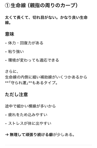 さむさむ:;(∩´﹏`∩);: 2026/03/25 22:11:26 こんばんは🌛今日は、雨で肌寒いですね(;;)春服着ると寒く感じる(ノ_ _)ノ💦そんな燐は…チャッピーに手相見てもらいました🥺笑なんかいい事も書いてあるけど、反対にマイナスもあって面白い😂笑AI何でも出来るじゃん!!ってなってる😂よく言えば我慢強いのですね、私🤣3ヶ月に1回は、手相変わる事もあるから又3ヶ月後やってみようかなお兄さんも是非やってみて♡今日も一日おつかれさまでした(っ´ω`c)おやすみなさい😴